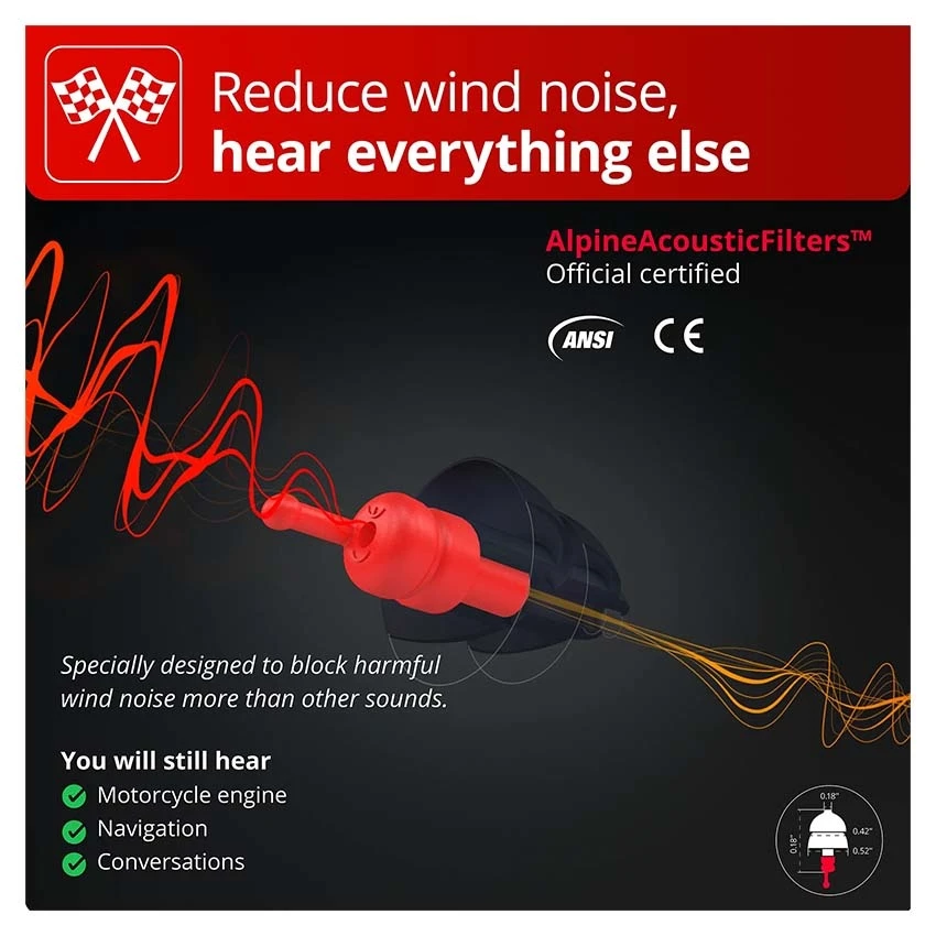 With the Alpine MotoSafe Race MotoGP earplugs you prevent hearing damage and are a lot less tired from the noise of wind noise. At an average speed of 120 km/h, your ears are exposed to 98 decibels of sound. This noise level means that after 7 minutes you already run the risk of permanent hearing damage, that you tire more quickly and that concentrating takes more energy.