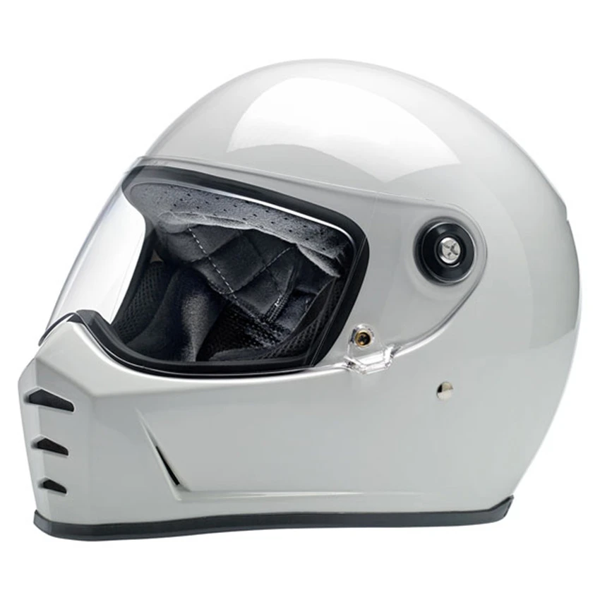 Progressively styled and rigorously tested, the Biltwell Lane Splitter, ECE and DOT approved, helmet is a top choice for riders who demand comfort and high performance. The aggressive looking lines of this helmet truly set it apart in the retro-styled helmet market. Features include a rugged ABS outer shell with hand-painted finish, ventilated and shock-absorbing EPS safety liner with gorgeous hand-stitched interior padding, removable cheek pads, clear anti-fog and anti-scratch CE-certified shield. Also the Lane Splitter contains audio communication pockets in ear recesses, Double-D chin strap lock mechanism and chin bar vents and venturi vent for ample airflow.Â