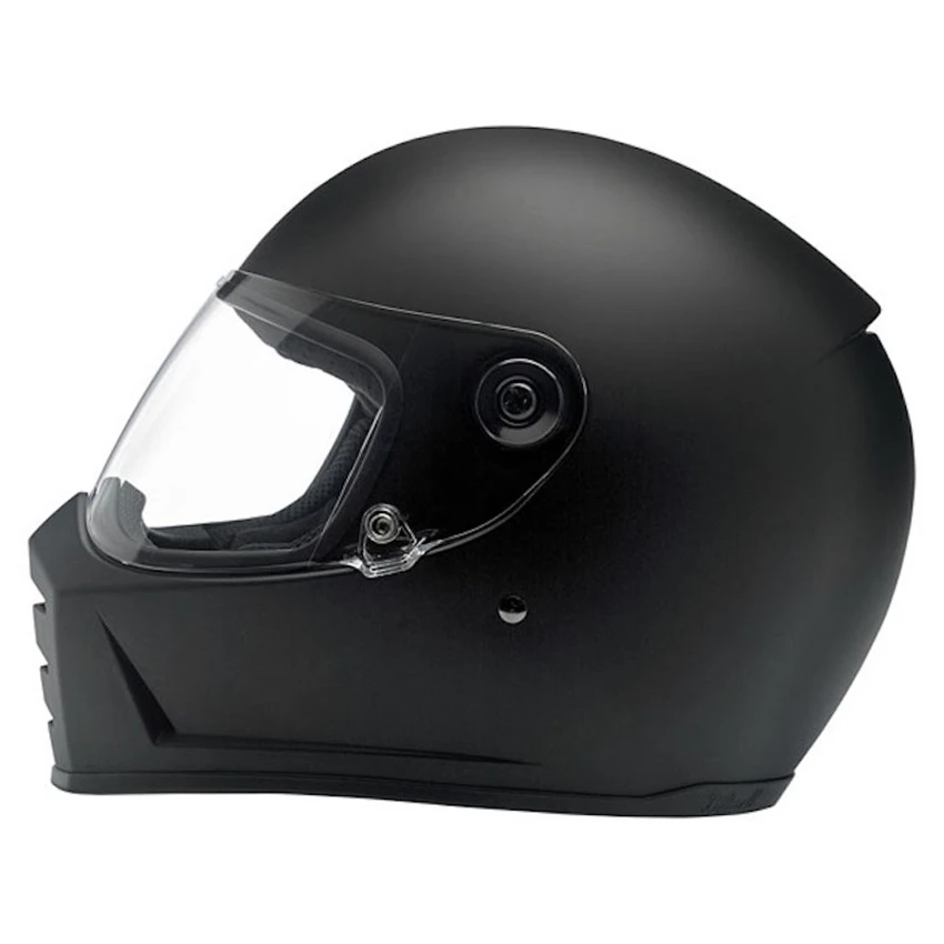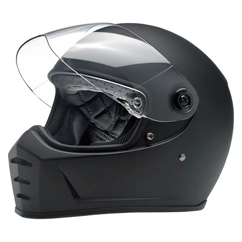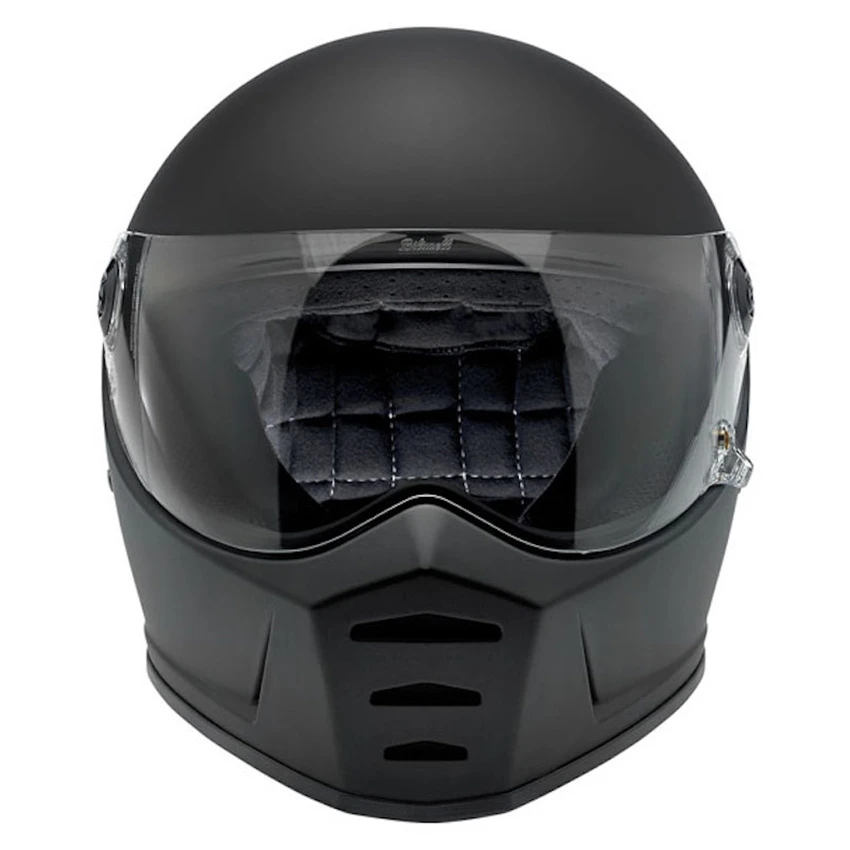 The Lane Splitter is crafted around Biltwell’s proprietary ABS outer shell and features a shock-absorbing EPS liner with hand-stitched interior padding, cheek pads and BioFoam chin bar cushion for comfort. Generous vents in the chin bar get the air flowing and the outlet in back lets hot air escape. The Lane Splitter shield boasts extremely accurate optics and simple hinge mechanics for high style and easy removal for replacement or cleaning. A brass peg and hole configuration on the left side of the shield offers speedy opening and secure closing with little fanfare or complication. Mesh pockets are included in the ear recess–perfect for aftermarket drop in communication systems.