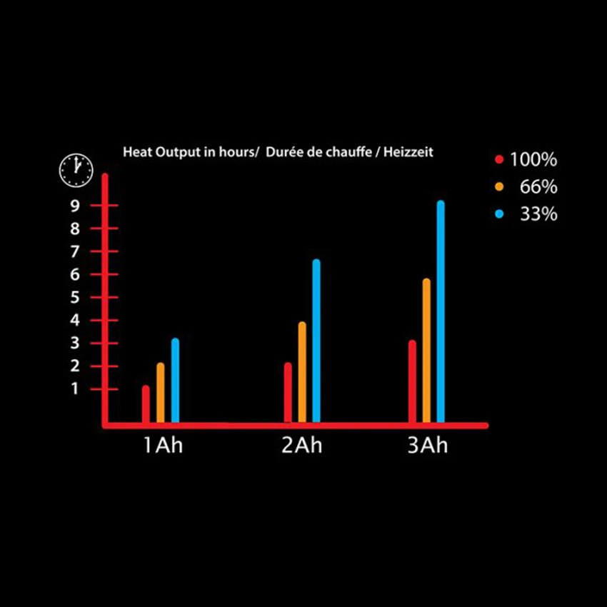 *The Gerbing battery kit is available in 3 types: 1Ah, 2Ah and 3Ah. The higher the Ah, the longer the useful life of your Gerbing heated glove. Below is an overview of the three battery kits and the corresponding performance.
