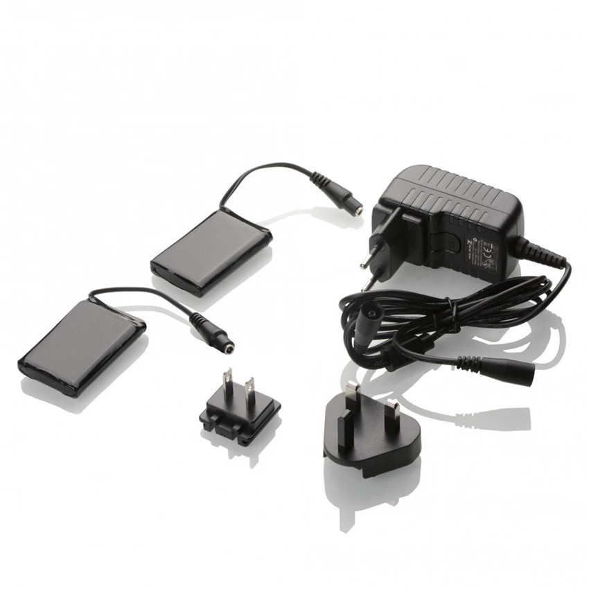 Klan-e battery kit for gloves and socks, consisting of a 7.4 volt battery and a charger capable of charging each battery with a current of 2000 mA. Each battery is made up of one separate cells measuring 40 x 60 x 10 mm each and a weight of 110 g.Â
